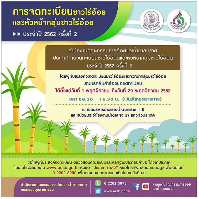 สอน.เปิดรับจดทะเบียนชาวไร่อ้อยและหัวหน้ากลุ่มชาวไร่อ้อยปี 62 ครั้งที่ 2 ถึง 29 พฤศจิกายนนี้ ระบุจดได้เขตบริหารอ้อยและน้ำตาลทราย 1-8 และหน่วยประจำโรงงานน้ำตาลทั้ง 57 แห่ง